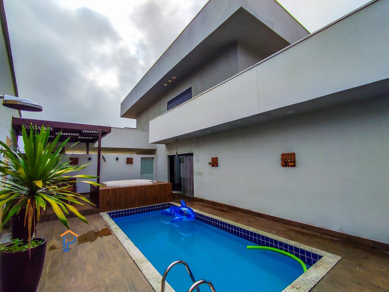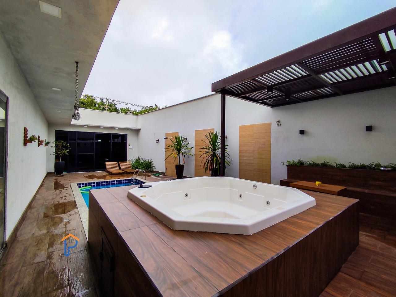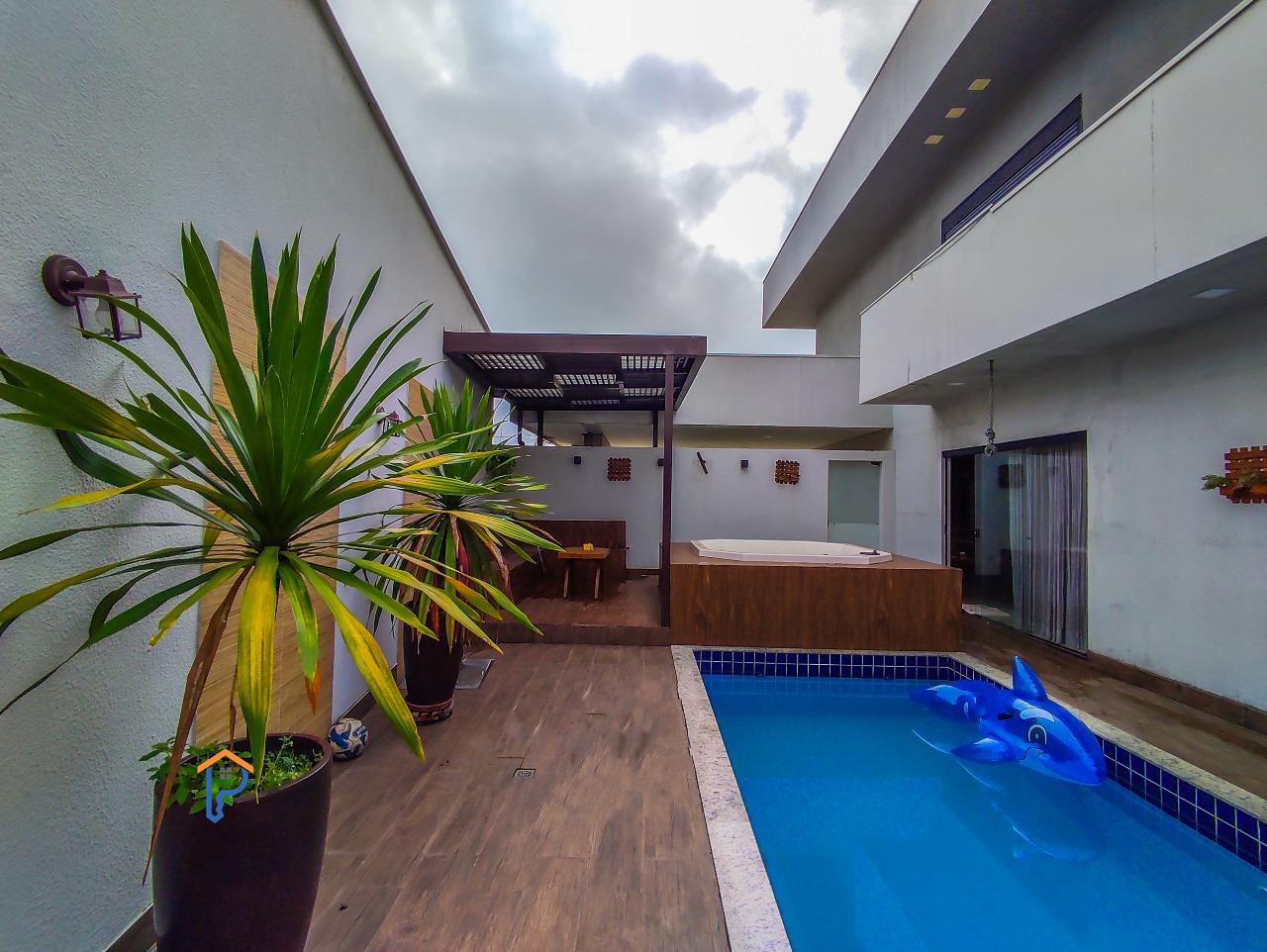 Primeiro pavimento com 1 quarto, banheiro social, home cinema, sala de estar e jantar, cozinha americana, área gourmet climatizada com churrasqueira, lavabo, uma suíte e piscina com uma banheira de hidromassagem e pergolado, lavanderia e despensa.