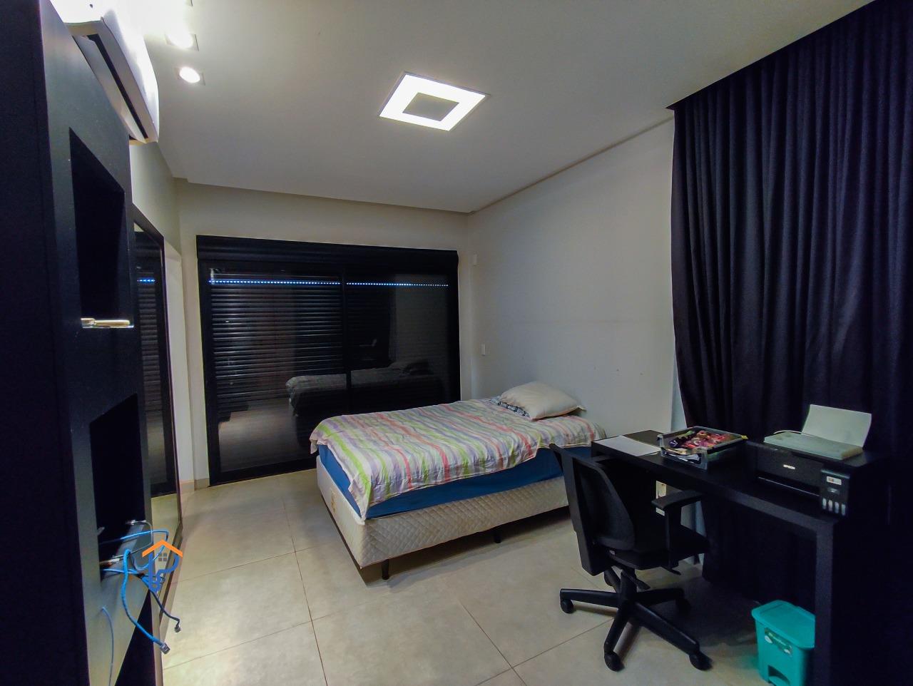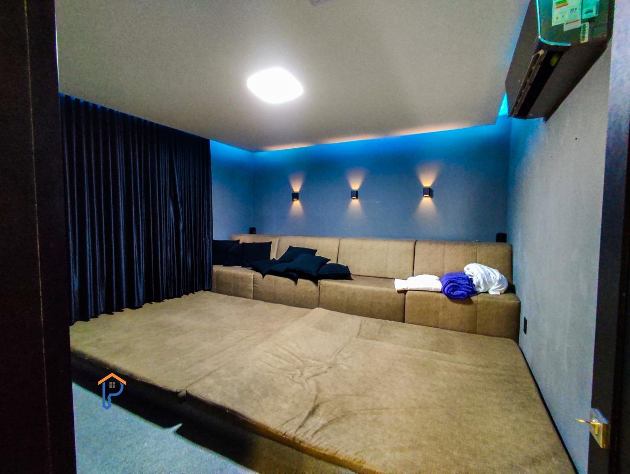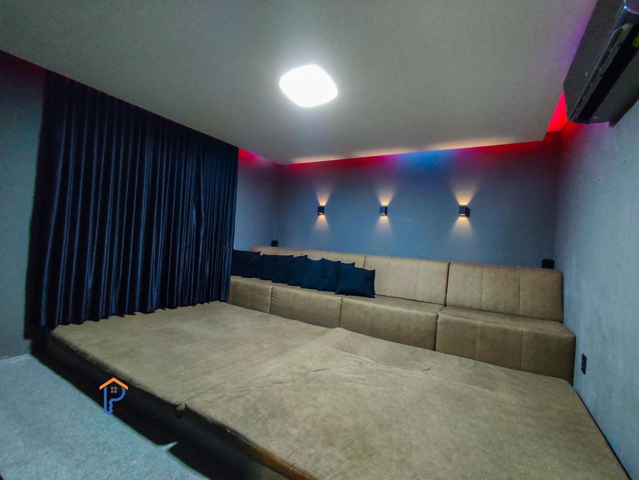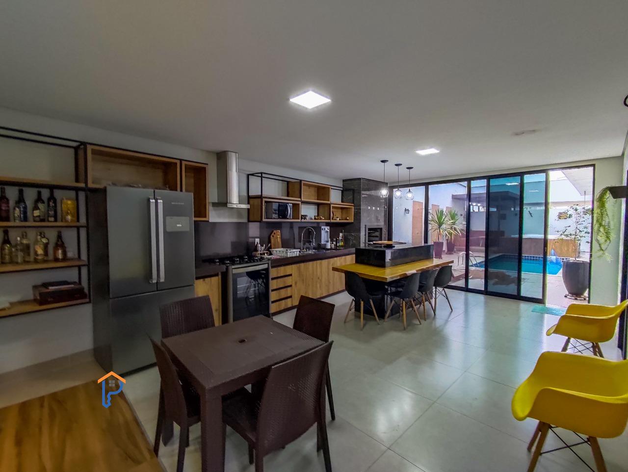 Primeiro pavimento com 1 quarto, banheiro social, home cinema, sala de estar e jantar, cozinha americana, área gourmet climatizada com churrasqueira, lavabo, uma suíte e piscina com uma banheira de hidromassagem e pergolado, lavanderia e despensa.